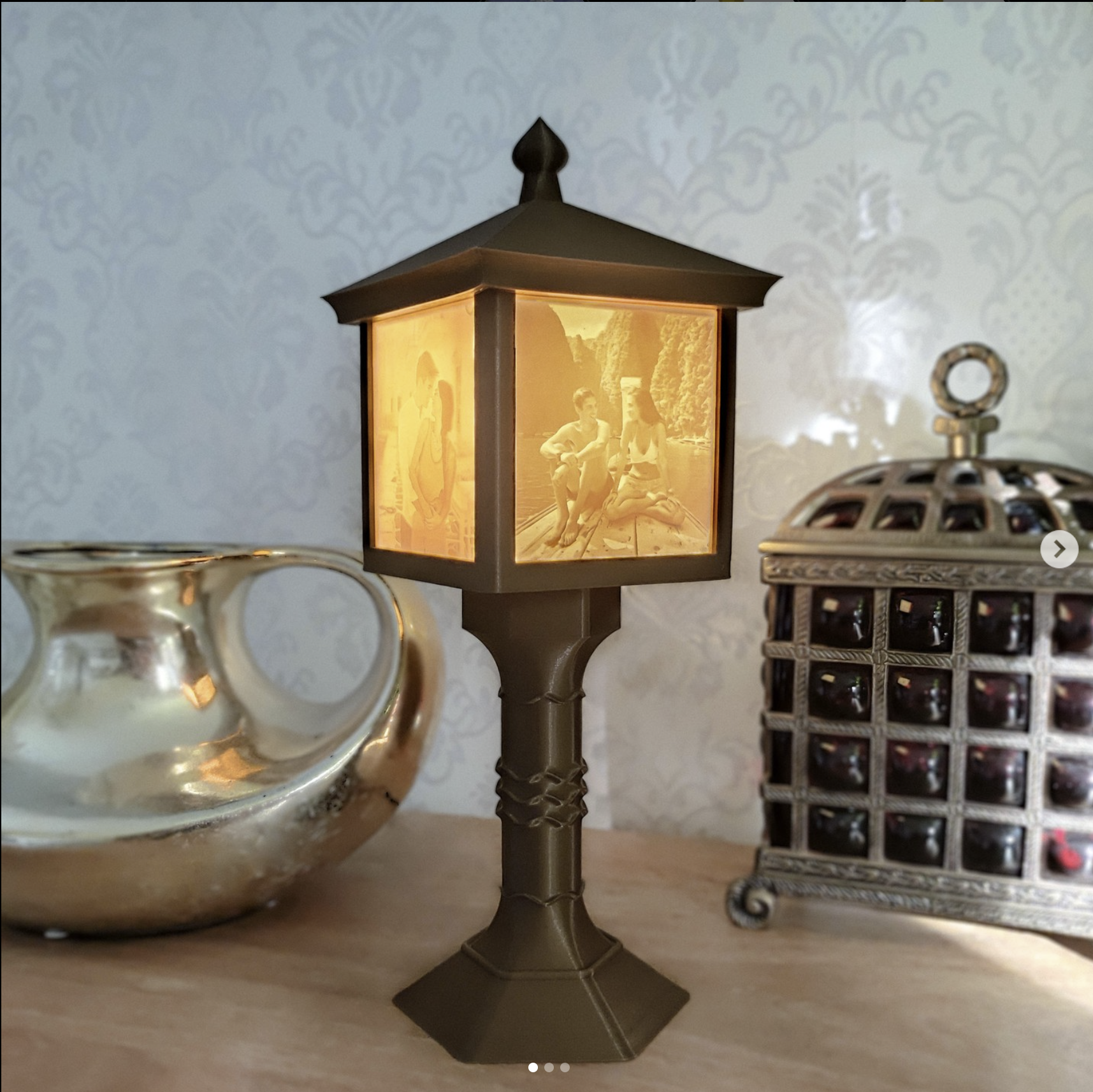Modern 3D baskı ve kişiselleştirilmiş litofanlarla yeniden tasarlanan bu vintage esintili sokak lambası tasarımıyla evinize zamansız bir zarafet katın. Büyük boy ışık başlığı ve klasik bir kaide, minyatür bir sokak lambası görünümü oluşturarak en sevdiğiniz anılarınızı şık bir şekilde aydınlatmak için mükemmeldir.